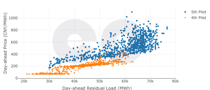 據(jù)估算,在第四輪試運(yùn)行期間,每增加1000MW的負(fù)荷平均導(dǎo)致現(xiàn)貨價(jià)格增加7元/MWh,而這一數(shù)字在第五輪試運(yùn)行期間漲到了13元/MWh。造成這一變化的原因可能是第五輪試運(yùn)行中的剩余負(fù)荷已經(jīng)接近市場(chǎng)的最大容量,導(dǎo)致市場(chǎng)競(jìng)爭(zhēng)性減弱。參與競(jìng)價(jià)的邊際機(jī)組通過(guò)更高的競(jìng)價(jià)提高利潤(rùn),導(dǎo)致了更陡峭的供給曲線。