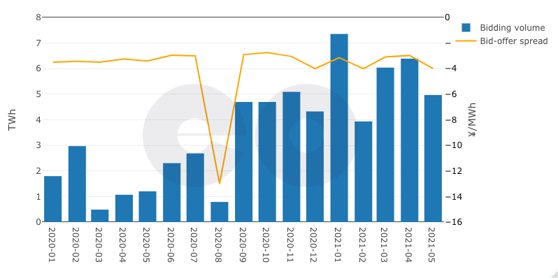 圖5展示了月度競(jìng)價(jià)電量以及競(jìng)價(jià)價(jià)差(月度競(jìng)價(jià)與煤電標(biāo)桿電價(jià)的差)。2020年8月,競(jìng)價(jià)價(jià)差下跌至-13元/兆瓦時(shí),遠(yuǎn)低于其他月份。原因是2020年8月開展了第四輪現(xiàn)貨市場(chǎng)試運(yùn)行——現(xiàn)貨市場(chǎng)的引入增加了發(fā)電行業(yè)的競(jìng)爭(zhēng),一定程度上削弱了月度競(jìng)價(jià)中的串謀行為。現(xiàn)貨市場(chǎng)也為電力零售商提供了緩沖,即使他們未能在月度競(jìng)價(jià)中簽訂合約,仍然可以在現(xiàn)貨市場(chǎng)購(gòu)買電能量。
