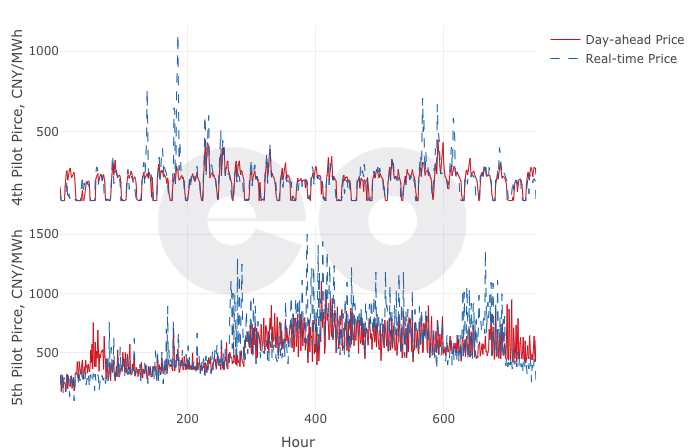 圖4展示了兩輪試運(yùn)行期間,日前和實(shí)時(shí)市場(chǎng)價(jià)格的動(dòng)態(tài)變化。第四輪現(xiàn)貨市場(chǎng)試運(yùn)行的價(jià)格周期性以日為單位較為明顯,但在第五輪中這一特征消失,且價(jià)格具有不規(guī)則波動(dòng)的特點(diǎn)。此外,除了少數(shù)幾個(gè)時(shí)段外,第四輪的日前與實(shí)時(shí)價(jià)格具有明顯的趨同性,但在第五輪中,這一特點(diǎn)消失,且更為頻繁地出現(xiàn)極端價(jià)格。