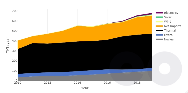 截至2020年底,廣東的電力總裝機(jī)容量達(dá)到141GW,其中65.8%來(lái)自化石燃料,8.5%來(lái)自可再生能源(即風(fēng)能和太陽(yáng)能)。2010年-2019年,隨著經(jīng)濟(jì)的快速發(fā)展,廣東的電力需求總量平均年增長(zhǎng)率為6%,盡管可再生能源占比仍然較低,但發(fā)電量增加了12倍,年增長(zhǎng)率為32%。同時(shí),廣東平均約有24%的電力來(lái)自于相鄰省份,其中大部分為來(lái)自云南省的水電。圖1展示了廣東省歷年來(lái)的發(fā)電能源構(gòu)成情況。
