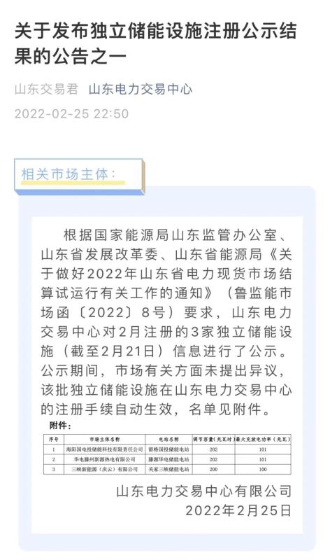 滕源華電儲(chǔ)能電站系中國(guó)華電首個(gè)大容量集中共享式電化學(xué)調(diào)峰類儲(chǔ)能項(xiàng)目,也是山東省首批儲(chǔ)能示范項(xiàng)目之一。該儲(chǔ)能電站投產(chǎn)后,在山東公司的指導(dǎo)下,滕州公司超前謀劃、周密部署,成立現(xiàn)貨交易小組,對(duì)儲(chǔ)能電站運(yùn)行經(jīng)濟(jì)性進(jìn)行全面測(cè)算,積極與山東省電力調(diào)控中心和交易中心溝通交流,在創(chuàng)新火電與儲(chǔ)能項(xiàng)目相融合的運(yùn)行管理模式的同時(shí),于2月25日在山東電力交易中心現(xiàn)貨平臺(tái)完成獨(dú)立儲(chǔ)能設(shè)施信息注冊(cè),使滕源華電儲(chǔ)能電站成為首批進(jìn)入電力現(xiàn)貨交易注冊(cè)公示名單的獨(dú)立儲(chǔ)能設(shè)施。