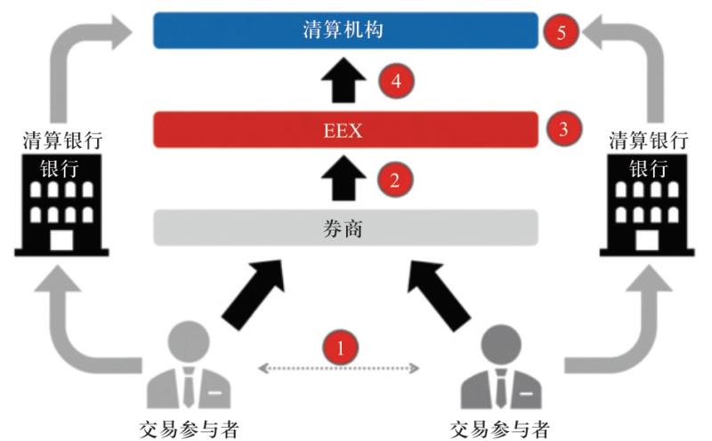 EEX日本電力期貨交易主體由五部分組成,即交易參與者、券商、EEX交易所、歐洲商品清算中心ECC(European Commodity Clearing)以及清算銀行。主要交易注冊流程及清算分為以下五步:①交易參與者與券商聯(lián)系,溝通確定交易;②券商將交易合約提供到EEX日本期貨交易平臺;③評估檢查相關(guān)交易風險;④相關(guān)交易被EEX及ECC 系統(tǒng)處理;⑤清算機構(gòu)與指定清算銀行進行清算。圖6顯示了EEX日本電力期貨交易流程及參與主體。