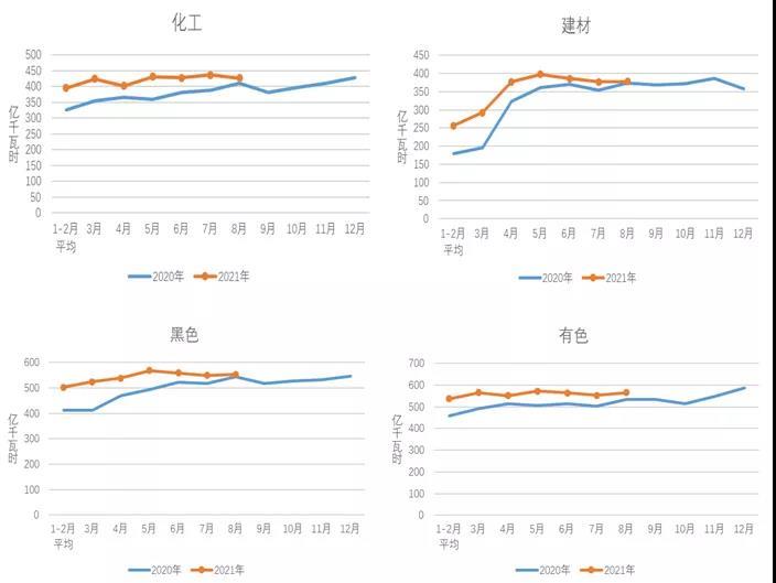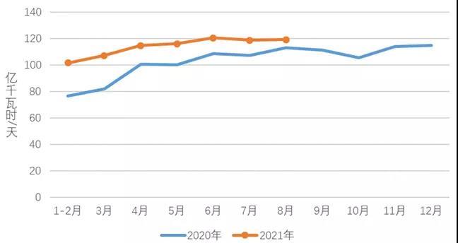 1-8月,化工行業(yè)用電量3338億千瓦時,同比增長9.9%,增速比上年同期提高11.2個百分點;建材行業(yè)用電量2721億千瓦時,同比增長14.5%,增速比上年同期提高14.9個百分點;黑色金屬冶煉行業(yè)用電量4302億千瓦時,同比增長12.6%,增速比上年同期提高11.3個百分點;有色金屬冶煉行業(yè)用電量4446億千瓦時,同比增長8.2%,增速比上年同期提高5.4個百分點。