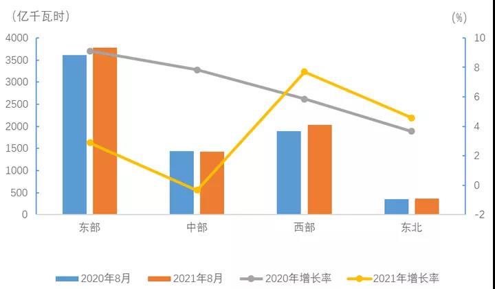 8月份,東、中、西部和東北地區(qū)全社會用電量增速分別為2.9%、-0.3%、7.7%和4.6%。