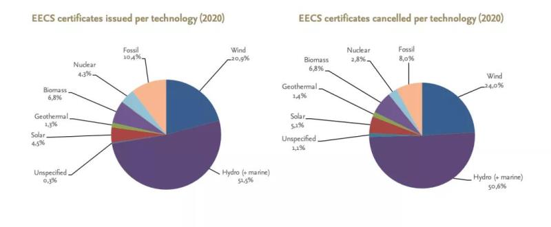 2020年歐洲不同能源品種GO簽發(fā)和核銷占比 來源:AIB(發(fā)放主體聯(lián)合會)2020年年報(bào)