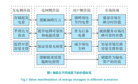 值得注意的是,儲能提供的同一項(xiàng)服務(wù),對于不同主體有不同的表現(xiàn)形式[20],如圖1所歸納。如削峰填谷,對電網(wǎng)而言表現(xiàn)為緩解調(diào)峰壓力[21],對新能源而言表現(xiàn)為存儲超發(fā)電量[22],對用戶而言表現(xiàn)為錯峰用電[23]。由于本文的落腳點(diǎn)在于市場機(jī)制,從市場的角度來看,以上3個(gè)價(jià)值均可以通過能量市場分時(shí)的價(jià)格信號加以體現(xiàn),由市場采購并統(tǒng)一提供。當(dāng)然,這些服務(wù)也可由發(fā)電側(cè)、用電側(cè)主體與儲能簽訂使用協(xié)議而自行購買。具體選擇哪種模式,是儲能市場設(shè)計(jì)中待探討的問題。