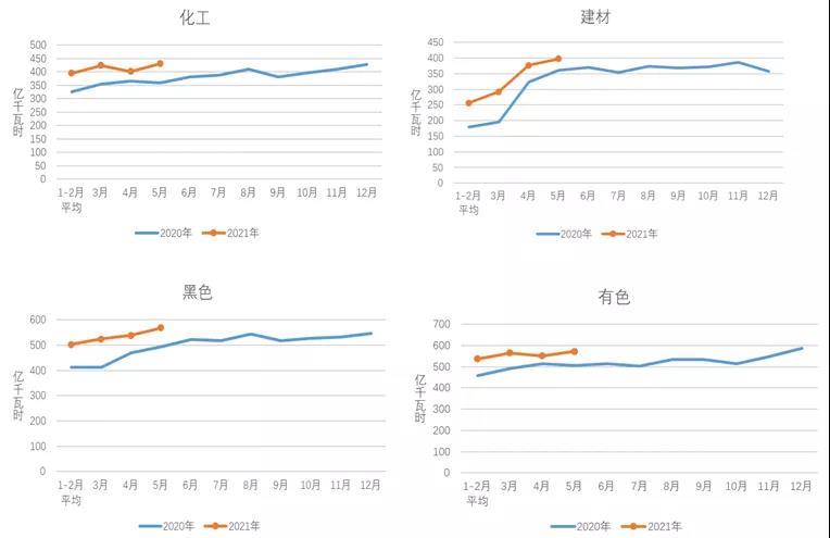 1-5月,化工行業(yè)用電量2048億千瓦時(shí),同比增長(zhǎng)12.8%,增速比上年同期提高17.0個(gè)百分點(diǎn);建材行業(yè)用電量1580億千瓦時(shí),同比增長(zhǎng)24.4%,增速比上年同期提高31.8個(gè)百分點(diǎn);黑色金屬冶煉行業(yè)用電量2639億千瓦時(shí),同比增長(zhǎng)18.3%,增速比上年同期提高19.8個(gè)百分點(diǎn);有色金屬冶煉行業(yè)用電量2763億千瓦時(shí),同比增長(zhǎng)10.2%,增速比上年同期提高8.2個(gè)百分點(diǎn)。