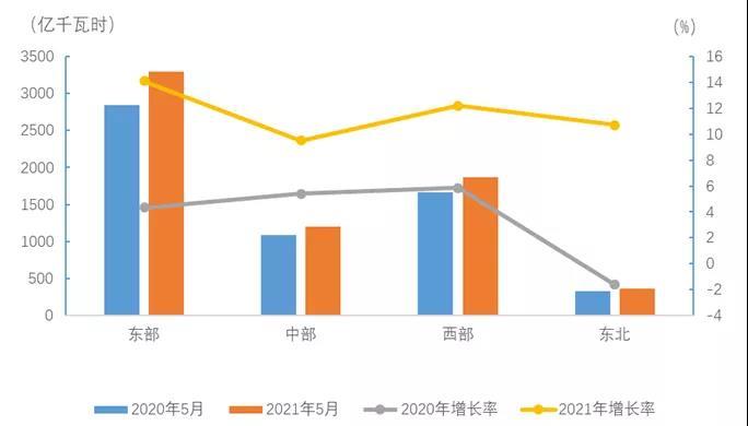 5月份,東、中、西部和東北地區(qū)全社會(huì)用電量增速分別為14.1%、9.5%、12.2%和10.7%。
