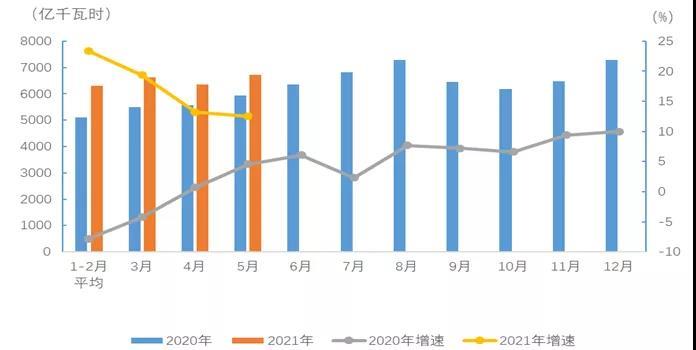 圖1 2020、2021年分月全社會(huì)用電量及其增速