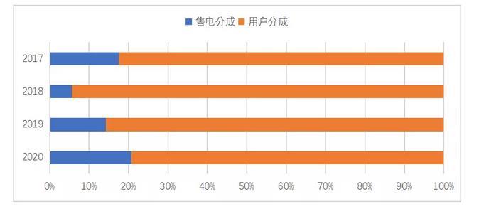從用戶側(cè)獲利結(jié)構(gòu)看(圖3),2017年至2020年期間,除2018年售電分成略低(5.7%),其余年份售電分成均在14%以上。其中,2018年至2020年期間,售電分成迅速增加,并在2020年達(dá)到了20.7%,為歷年來最高??傮w來看,近年售電公司的分成水平呈現(xiàn)出穩(wěn)中有升的趨勢,售電公司能充分享受到供給側(cè)的讓利。