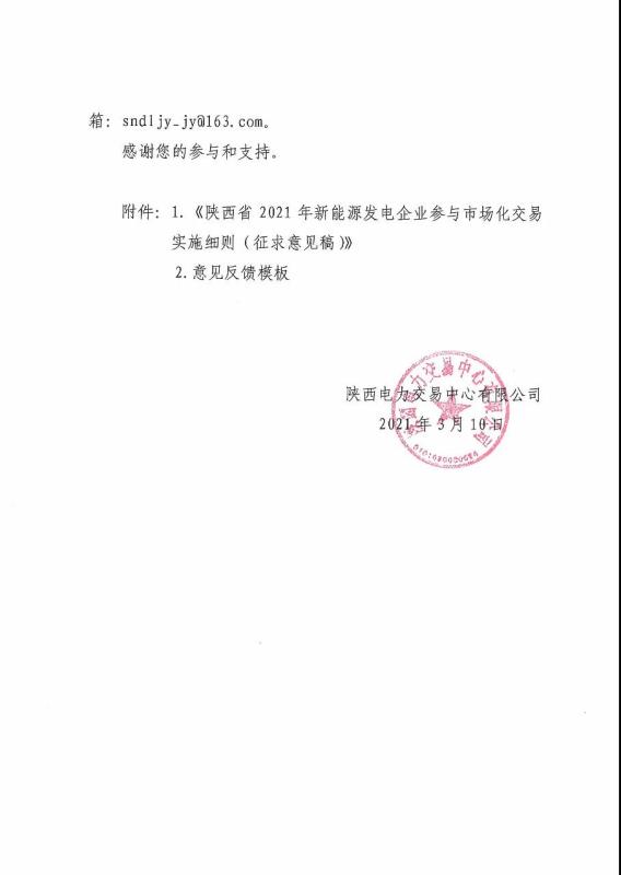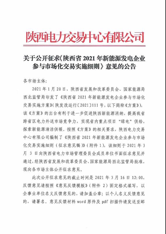 關(guān)于公開征求《陜西省2021年新能源發(fā)電企業(yè)參與市場化交易實施細(xì)則》意見的公告
