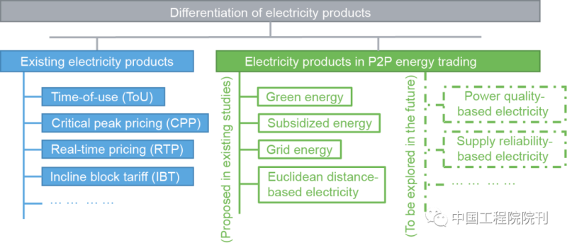 電力產(chǎn)品的異質(zhì)化是端對(duì)端能源交易很有潛力的一個(gè)發(fā)展方向?,F(xiàn)有研究和實(shí)踐主要從時(shí)間、距離和類型(如綠色電力、補(bǔ)貼電力和電網(wǎng)電力等不同類型)三方面對(duì)電力產(chǎn)品進(jìn)行區(qū)別。未來可以對(duì)電力產(chǎn)品進(jìn)行進(jìn)一步的異質(zhì)化,如基于電能質(zhì)量的異質(zhì)化、基于供電可靠性的異質(zhì)化等。