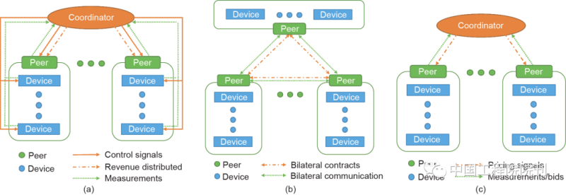 分布式市場(chǎng)是一種介于集中式市場(chǎng)和分散式市場(chǎng)之間的市場(chǎng)機(jī)制。與集中式市場(chǎng)的協(xié)調(diào)者直接控制用戶的能源輸入/輸出量或直接控制用戶設(shè)備不同,分布式市場(chǎng)的協(xié)調(diào)者往往通過價(jià)格信號(hào)間接影響用戶的行為。與完全分散式市場(chǎng)相比(如與文獻(xiàn)相比),分布式市場(chǎng)具有一個(gè)市場(chǎng)協(xié)調(diào)者,因此用戶的用電行為可以得到更好的協(xié)調(diào)。與集中式市場(chǎng)相比(如與文獻(xiàn)相比),分布式市場(chǎng)往往需要更少的量測(cè)數(shù)據(jù),并且也不直接控制用戶設(shè)備,因此可以更好地保障用戶的隱私和自治性??傊植际绞袌?chǎng)結(jié)合了集中式市場(chǎng)和分散式市場(chǎng)的特點(diǎn),是一種居中的解決方法。
