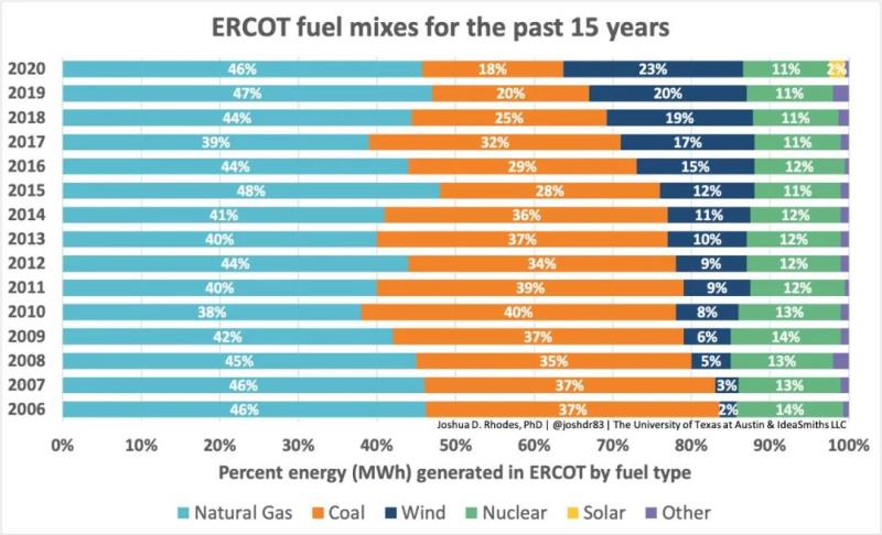 從整體來(lái)看,ERCOT已經(jīng)預(yù)計(jì)到風(fēng)電可能會(huì)有4-5GW的不能運(yùn)行,但是沒(méi)有預(yù)計(jì)到火電設(shè)備的問(wèn)題,所以這次電荒不應(yīng)該歸咎于風(fēng)電自身。但是德州的電網(wǎng)現(xiàn)在的風(fēng)電發(fā)電占比大概在23%左右(如下圖),如果風(fēng)電占比進(jìn)一步提高,而火電占比進(jìn)一步下降,會(huì)不會(huì)就有風(fēng)險(xiǎn)?