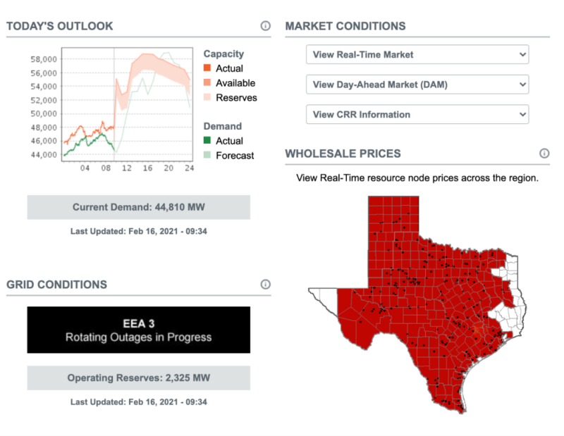寒潮當(dāng)然是電荒的客觀原因,ERCOT在2月11號(hào)發(fā)布的新聞就預(yù)計(jì),由于遭遇帶來(lái)數(shù)十年來(lái)最冷的天氣,德州的電力需求量將創(chuàng)歷史新高。德州的電力市場(chǎng)化程度很高,點(diǎn)擊http://www.ercot.com/就可以看到當(dāng)日實(shí)時(shí)的電力需求和預(yù)測(cè)、以及各地區(qū)的電力批發(fā)價(jià)格。注意電力批發(fā)價(jià)格是發(fā)電廠提供給電力零售商的價(jià)格,之后再由零售商銷(xiāo)售給消費(fèi)者。
