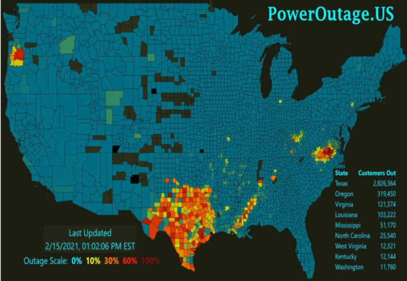 中國(guó)儲(chǔ)能網(wǎng)訊:最近幾天,美國(guó)大部分地區(qū)經(jīng)歷了罕見(jiàn)的大規(guī)模寒潮天氣。在寒潮影響下,美國(guó)德克薩斯州電力批發(fā)市場(chǎng)上電力價(jià)格超過(guò)了$9/度。當(dāng)?shù)貢r(shí)間的2月15日,德克薩斯州電力可靠性委員會(huì)(ERCOT,負(fù)責(zé)電網(wǎng)運(yùn)行和管理電力批發(fā)市場(chǎng)的調(diào)度)宣布進(jìn)入緊急狀態(tài),并于15日凌晨1:25開(kāi)始輪流停電(rotating outages)。這一事件引發(fā)了能源界和氣候界的廣泛關(guān)注,其中關(guān)于電力市場(chǎng)設(shè)計(jì)和可再生能源電力的諸問(wèn)題,對(duì)我國(guó)電力市場(chǎng)改革和可再生能源電力發(fā)展或有啟示。下圖是美國(guó)2月15日的停電地圖: