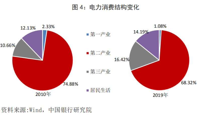 二是清潔電力生產(chǎn)比重明顯提高。近十年來我國清潔電力生產(chǎn)比重實現(xiàn)穩(wěn)步提升。2020 年 10 月,一次電力中的水電、核電產(chǎn)量和風電發(fā)電量占比合計為 33.6%,較上年同期提高 3.9 個百分點,相比 2010年 10 月提升 11.2 個百分點。三是電力消費結(jié)構(gòu)不斷優(yōu)化。2019 年,全社會用電量為7.23 萬億千瓦時,同比增長 4.47%,較 2010 年 14.76%的增速有大幅下降;一、二、三產(chǎn)和城鄉(xiāng)居民生活用電量分別同比增長 4.5%、3.1%、9.5%和 5.7%。與 2010 年相比,2019 年我國第三產(chǎn)業(yè)和居民生活用電的占比均有所提升,合計已超過總用電量的 30%,第二產(chǎn)業(yè)用電量占比下降 6.56 個百分點(圖 4)。