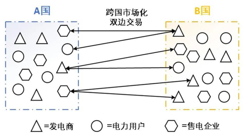 二是由兩國發(fā)電企業(yè)、電力用戶、售電公司等市場主體進(jìn)行直接對接協(xié)商,開展電力交易。協(xié)議達(dá)成后,市場主體應(yīng)將協(xié)議在規(guī)定的時間內(nèi)提交至所在國家或地區(qū)的電力調(diào)度、交易機(jī)構(gòu)。市場化雙邊交易示意如圖2所示。