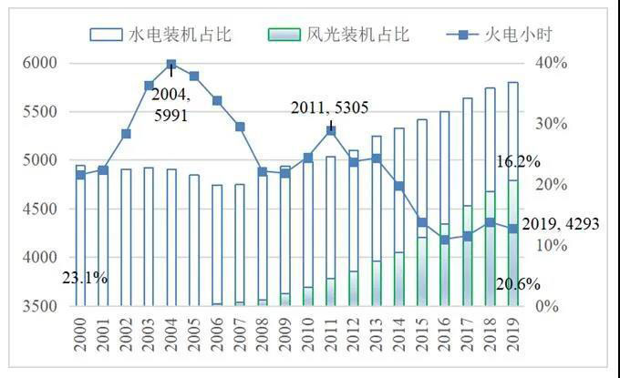 圖 1 全國(guó)水電、風(fēng)光裝機(jī)占比和火電利用小時(shí)