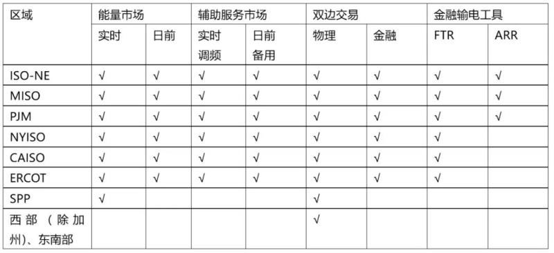 能源市場(chǎng)由兩個(gè)部分組成:實(shí)時(shí)的市場(chǎng)(RTM)和日前市場(chǎng)(DAM)。提供平衡和備用的輔助市場(chǎng)下,RTM和DAM通常被分別叫做實(shí)時(shí)調(diào)頻和日前備用。但對(duì)于平衡和備用市場(chǎng),不同區(qū)域市場(chǎng)的準(zhǔn)確名稱有所不同。值得指出的是,金融輸電權(quán)市場(chǎng)通過提供阻塞風(fēng)險(xiǎn)的對(duì)沖協(xié)助了市場(chǎng)主體參與雙邊交易。表1總結(jié)了美國(guó)各個(gè)電力市場(chǎng)的概況。