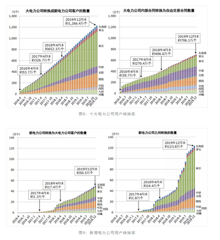 日本零售市場的電價以兩部制為主,但改革后的電價菜單比原來增加了3倍多。除了分時電價、分段電價之外,還有節(jié)電電價、運動電價、特定時段免費電價等各式各樣的電價套餐可供用戶選擇。零售電商不僅提供新的電價套餐,還不斷實現(xiàn)不同商業(yè)服務的整合和融合,提高服務附加價值。因此,以居民用戶為主的低壓市場用戶轉(zhuǎn)換率較高,如圖8所示,截止2019年12月,由大型電力公司轉(zhuǎn)換至新增電力公司的客戶數(shù)量達到1266萬個,2019年12月轉(zhuǎn)換率達到13.9%;大型電力公司內(nèi)部之間的合同轉(zhuǎn)換客戶數(shù)量也達到706萬個。如圖9所示,由新增電力公司轉(zhuǎn)換為大型電力公司的數(shù)量為51萬個,新增電力公司之間的互相轉(zhuǎn)換為124萬個。