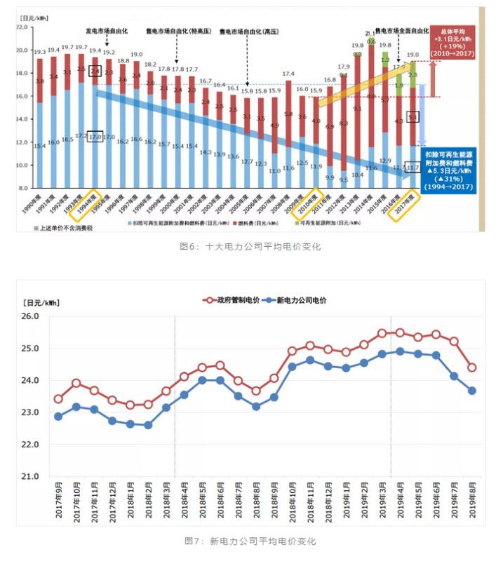 降低電價是日本電改的重要目標之一,但實際中由于通貨膨脹、燃料價格上漲等因素影響,日本并未能如期實現(xiàn)現(xiàn)貨價格降低的目標,其中東日本地震之后由于受燃料和可再生能源附加費影響電價更出現(xiàn)不降反升。2017年與2010年相比,如圖6所示,十大電力公司電價平均上漲了19%,[5]其中居民電價上漲了16%,工業(yè)電價上漲了21%。但從電價結(jié)構(gòu)來看,若扣除燃料和可再生能源附加費因素影響,居民和工業(yè)用電的平均電價則較電改前(1994年)下降了31%;另外新增電力公司的電價更低于政府管制定價水平(圖7,不含可再生能源附加費和消費稅)。