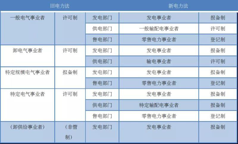 2016年4月,日本根據(jù)新修訂的電氣事業(yè)法(電力法),取消了按經(jīng)營規(guī)模的縱向分類法,即:“一般電氣事業(yè)者”(十大電力公司)、“卸電氣事業(yè)者”(200萬kW以上裝機容量的發(fā)電企業(yè))、“卸供給事業(yè)者”(200萬kW以下裝機容量的發(fā)電企業(yè),稱為獨立發(fā)電商“IPP”)、“特定規(guī)模電氣事業(yè)者”(50kW以上規(guī)模的供電企業(yè),稱為新增電力企業(yè)“PPS”)、“特定電氣事業(yè)者”(限特定點的供電企業(yè))等。