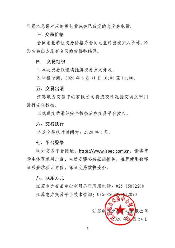 2020年8月江蘇電力市場購電側月內合同電量轉讓交易公告