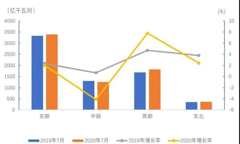 7月份,東、中、西部和東北地區(qū)全社會(huì)用電量增速分別為2.0%、-4.1%、7.8%和2.4%,其中,東、中部地區(qū)全社會(huì)用電量增速比上月回落4.4和9.6個(gè)百分點(diǎn),西部和東北地區(qū)②全社會(huì)用電量增速比上月提高0.8和2.0個(gè)百分點(diǎn)。