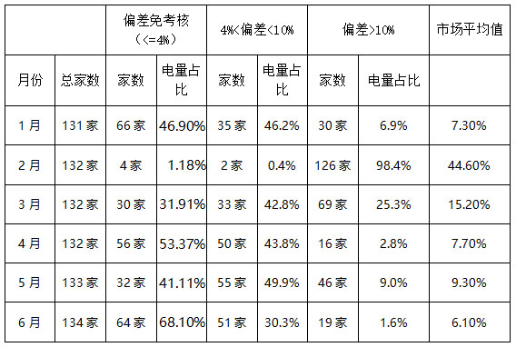 在用戶側(cè)130多家市場主體中,6月份偏差控制最好,免考核電量占比為68.1%,偏差率低于10%的市場主體共計115家,占總用電量的98.4%。從偏差率各分段區(qū)間家數(shù)和電量占比看,市場主體電量越多,月度電量偏差越小,說明省內(nèi)疫情得到有效控制,中大型工商業(yè)電力用戶已基本上恢復(fù)了正常生產(chǎn)。各月偏差率分布見下圖。
