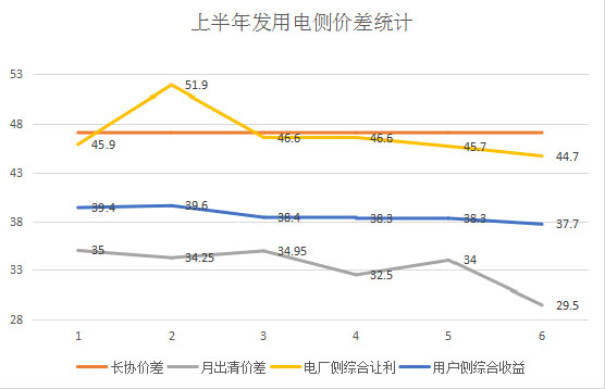 上半年月度競價交易總電量占比不到10%,價差相對穩(wěn)定,總體上(絕對值數(shù)據(jù))呈下降態(tài)勢,從1月份的-35厘/千瓦時到6月份的-29.5厘/千瓦時,與市場預(yù)期基本一致。從上半年的數(shù)據(jù)來看,綜合長協(xié)和月度競價情況,電廠和用戶側(cè)度電價差基本上穩(wěn)定在平均值(-46.41厘/千瓦時和-38.45厘/千瓦時)附近,雖然2月份電廠讓利幅度較大,超過50厘/千瓦時,原因主要是電廠偏差電量考核所致,用戶側(cè)受購售電合同價格已固化價差收益,所以收益未有明顯變化。