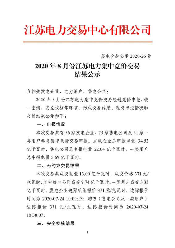 2020年8月份江蘇電力集中競價(jià)交易結(jié)果公示