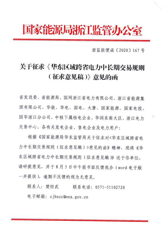 文件向上海、安徽征求所轄發(fā)電企業(yè)意見,能源局浙江監(jiān)管辦公室已發(fā)布便函。