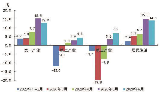 6月份,第一、二、三產(chǎn)業(yè)和居民生活用電量增速分別為12.9%、4.3%、7.0%和14.3%。其中,第二、三產(chǎn)業(yè)用電量增速較5月份分別回升1.4、3.5個(gè)百分點(diǎn),生產(chǎn)經(jīng)營活動(dòng)水平繼續(xù)提升,第一產(chǎn)業(yè)和居民生活用電量增速連續(xù)兩個(gè)月超過10%。上半年,三次產(chǎn)業(yè)和居民生活用電量增速分別為8.2%、-2.5%、-4.0%和6.6%,第二、三產(chǎn)業(yè)運(yùn)行較去年仍有差距。