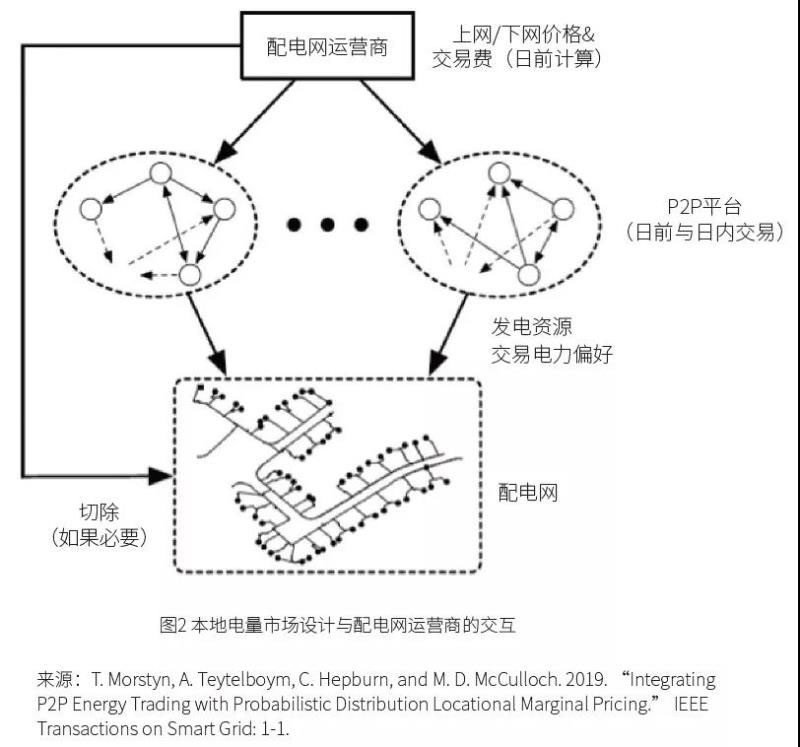 數(shù)字化時(shí)代,市場(chǎng)的“開放”特性有望進(jìn)一步加強(qiáng)。目前的批發(fā)市場(chǎng),由于其較高的交易成本和參與成本,只有大用戶有參與的可能。配電網(wǎng)側(cè)幾乎無法形成市場(chǎng),中小用戶/發(fā)電商難以直接交易。隨著先進(jìn)IT技術(shù)的進(jìn)步與成本的大幅下降,一些配電網(wǎng)側(cè)的交易平臺(tái)(比如基于區(qū)塊鏈P2P)也將改變上述局面。圖2顯示了一個(gè)P2P結(jié)合區(qū)塊鏈在配電網(wǎng)側(cè)的應(yīng)用。
