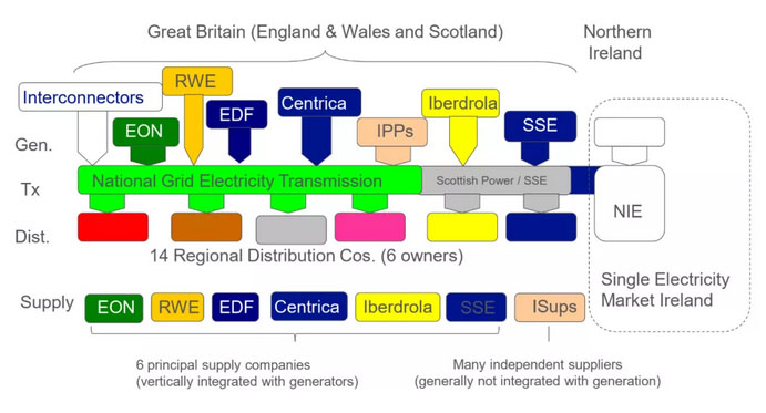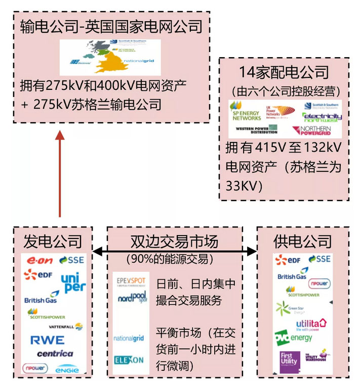 英國(guó)市場(chǎng)成員包括發(fā)電公司、輸電公司、配電公司、供電(售電)公司、系統(tǒng)運(yùn)營(yíng)商、結(jié)算公司、電力交易機(jī)構(gòu)等。