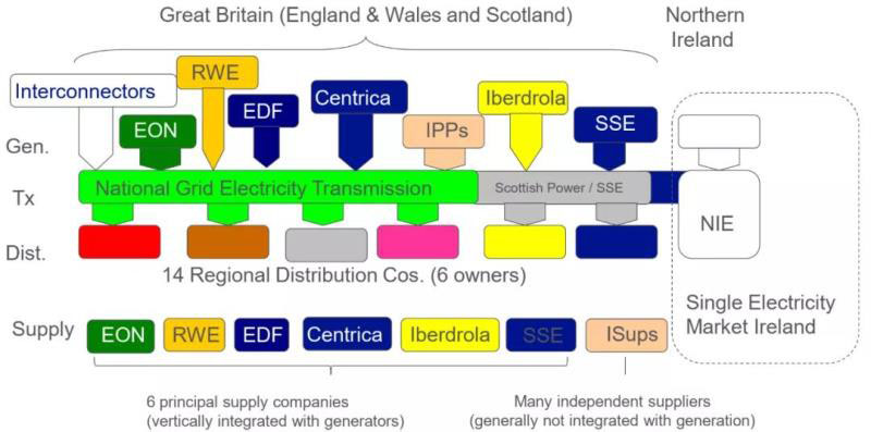 輸電公司。英格蘭和威爾士地區(qū)輸電資產(chǎn)歸屬于英國(guó)國(guó)家電網(wǎng)公司;蘇格蘭地區(qū)輸電資產(chǎn)歸屬發(fā)輸配售垂直一體化的蘇格蘭電力公司以及蘇格蘭和南方能源集團(tuán)公司。輸電網(wǎng)在英格蘭和威爾士地區(qū)以及蘇格蘭地區(qū)實(shí)行全國(guó)統(tǒng)一調(diào)度,調(diào)度機(jī)構(gòu)隸屬于英國(guó)國(guó)家電網(wǎng)公司。