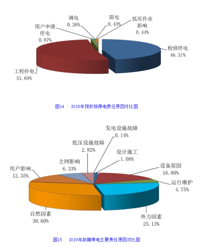 2019年,“計劃停電”仍是造成我國中壓用戶停電的主要原因,占用戶總停電時間的59.84%,影響用戶平均停電時間為8.21小時/戶。其中,工程與檢修停電分別占預(yù)安排總停電時間的51.69%、46.31%;“故障停電”占總停電的40.16%,影響用戶平均停電時間為5.51小時/戶。