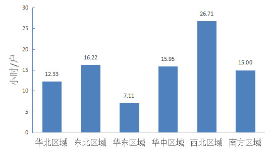 2019年華北、東北、華東、華中、西北、南方六大區(qū)域中,華東區(qū)域用戶的平均供電可靠率最高,平均停電時間為7.11小時/戶。西北區(qū)域用戶的平均供電可靠率最低,平均停電時間為26.71小時/戶。