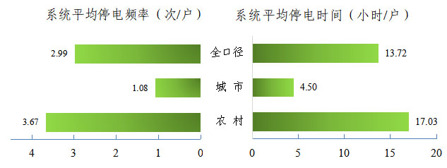 2019年全國用戶平均停電時間13.72小時/戶,同比減少2.03小時/戶,其中,城市地區(qū)4.50小時/戶,農(nóng)村地區(qū)17.03小時/戶。城市和農(nóng)村相差12.53小時/戶。全國用戶平均停電頻率2.99次/戶,同比減少0.29次/戶,其中,城市地區(qū)1.08次/戶,農(nóng)村地區(qū)3.67次/戶,城市和農(nóng)村相差2.59次/戶。
