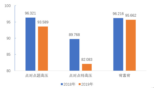 2019年,納入可靠性統(tǒng)計的點對點超高壓直流輸電系統(tǒng)能量可用率為93.589%,同比下降2.732百分點;點對點特高壓直流輸電系統(tǒng)能量可用率為82.0.83%,同比下降7.685個百分點;背靠背直流輸電系統(tǒng)能量可用率為95.662%,同比下降0.554個百分點。