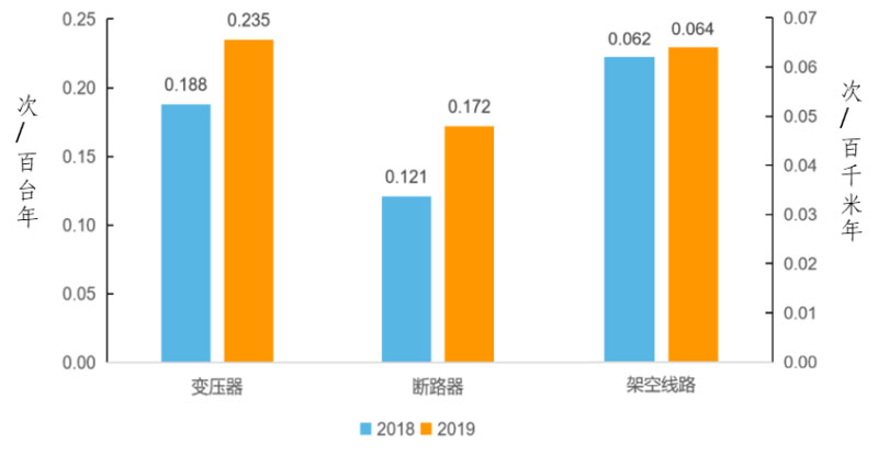 2019年,架空線路、變壓器、斷路器三類主要設(shè)施的強迫停運率分別為0.064次/百千米年、0.235次/百臺年、0.172次/百臺年,同比分別增加0.002次/百千米年、0.047次/百臺年、0.051次/百臺年。