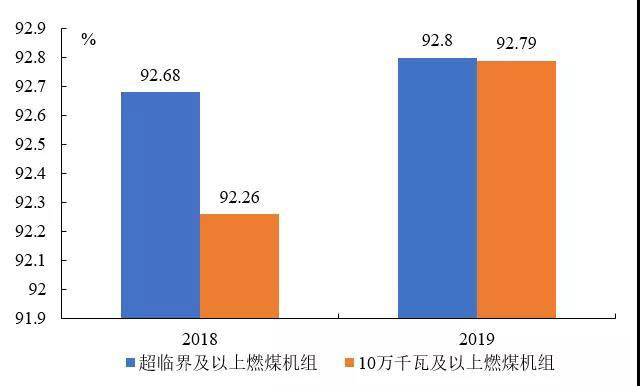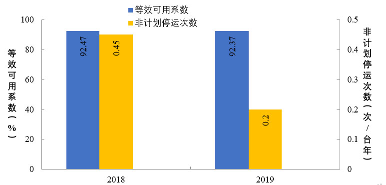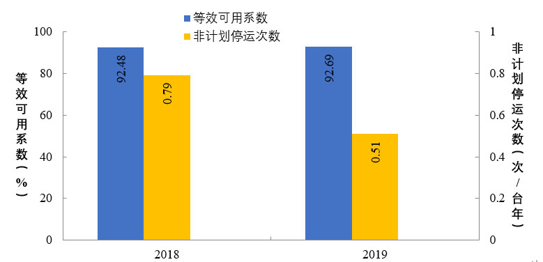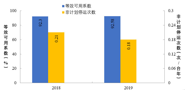 2019年,納入可靠性管理的超臨界及以上燃煤機組共547臺。平均等效可用系數(shù)92.8%,同比增長0.12個百分點,非計劃停運0.48次/臺年,同比降低0.33次/臺年。