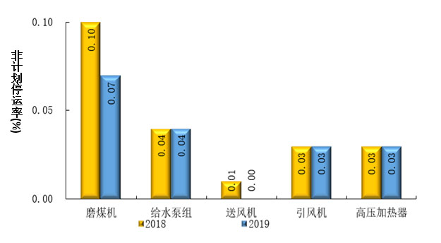 2019年,我國大型燃煤機組配套輔助設(shè)備健康水平穩(wěn)定提高。參與統(tǒng)計的五種輔助設(shè)備即磨煤機、給水泵組、送風機、引風機、高壓加熱器的運行系數(shù)同比分別上升0.86、2.82、1.08、1.08和1.09個百分點。磨煤機、送風機非計劃停運率同比下降,給水泵組、引風機、高壓加熱器同比持平。