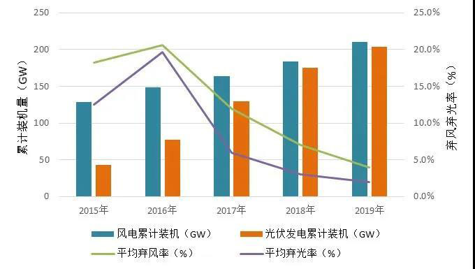 圖1 2015-2019年風(fēng)、光累計(jì)裝機(jī)量及棄風(fēng)、棄光率