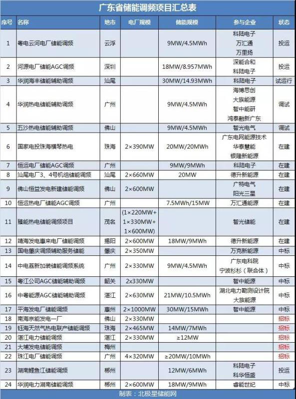 自2018年9月1日期,《廣東調頻輔助服務市場交易規(guī)則(試行)》執(zhí)行以來,廣東儲能調頻市場發(fā)展火熱,到目前為止招標、在建及投運的儲能調頻項目已有20余個。如圖所示: