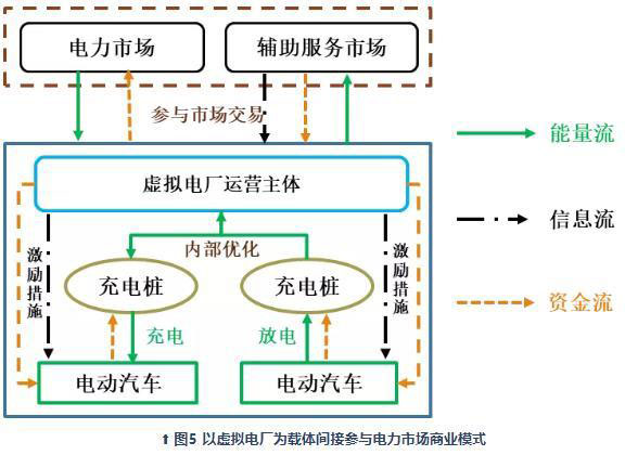 分散的電動(dòng)汽車(chē)參與電力市場(chǎng)交易,將面臨較高的市場(chǎng)門(mén)檻,從而影響用戶響應(yīng)程度。虛擬電廠是利用先進(jìn)的調(diào)控、計(jì)量、通信技術(shù)把分布式發(fā)電、分布式儲(chǔ)能設(shè)施、可控負(fù)荷等不同類(lèi)型分布式資源進(jìn)行整合優(yōu)化參與市場(chǎng)交易的載體。電動(dòng)汽車(chē)作為移動(dòng)儲(chǔ)設(shè)施具備的優(yōu)異特性,使其能夠很好地融入虛擬電廠,從而以間接方式參與電力市場(chǎng),打破了市場(chǎng)門(mén)檻的限制。該模式工作原理如圖5所示。