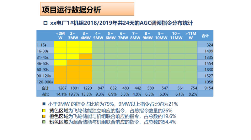基于數(shù)據(jù),我們做了一些深入的統(tǒng)計(jì)分析,小于9MW的指令大概有79%,9MW以上的有21%,不同的顏色代表不同的技術(shù)區(qū)域。黃色區(qū)域單獨(dú)采用飛輪儲能的技術(shù),占總指令數(shù)量的26%。橙色區(qū)域使用飛輪儲能與機(jī)組聯(lián)合響應(yīng)的調(diào)節(jié)指令,占總數(shù)19.6%,大家不要小看火電機(jī)組和燃?xì)鈾C(jī)組的能力,在自身的基礎(chǔ)上再疊加混合儲能系統(tǒng),最后的調(diào)節(jié)性能更好。有一些火電廠,做了儲能調(diào)頻的技術(shù)改造,但K值提高并不多,原因是機(jī)組不夠優(yōu)化。粉色區(qū)域?yàn)榛旌蟽δ芘c機(jī)組聯(lián)合響應(yīng)的指令,占總指令數(shù)的54.4%。