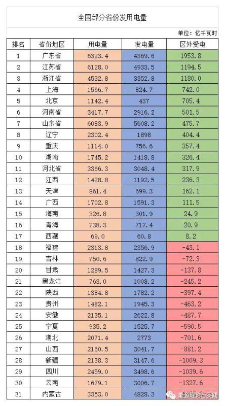 從各省(市)發(fā)用電量看,電力資源分布與需求呈逆向分布特征明顯,2018年各省區(qū)外受電量總和8723億千瓦時(shí),占當(dāng)?shù)乜偘l(fā)電量20.4%。廣東、江蘇、山東省用電量位居前三,山東、江蘇、內(nèi)蒙古發(fā)電量位居前三,廣東、江蘇、浙江省區(qū)外受電量位居前三,北京、上海、重慶區(qū)外受電占用電量的比重位居前三。