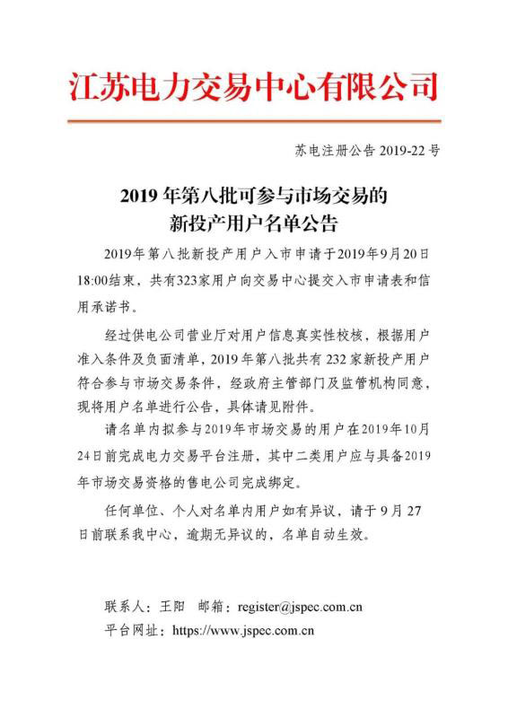 中國儲(chǔ)能網(wǎng)訊:江蘇電力交易中心于2019年9月26日發(fā)布了2019年第八批可參與市場交易的新投產(chǎn)用戶名單公告。